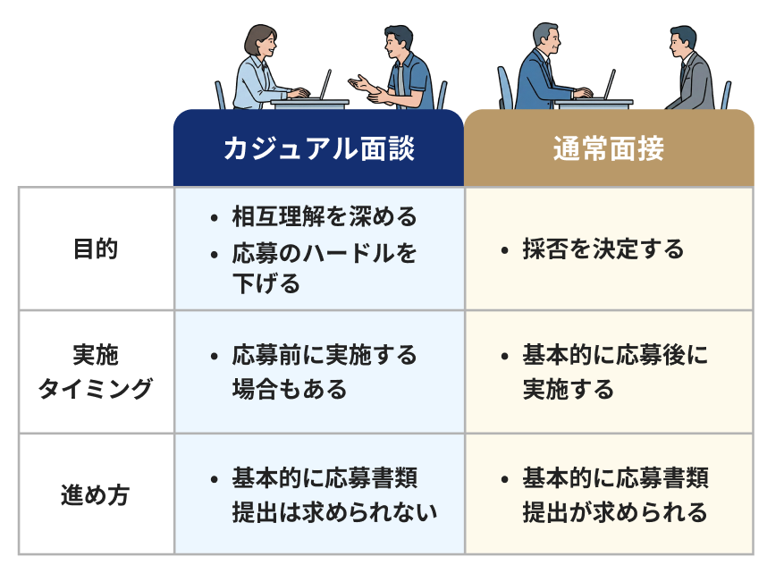 カジュアル面談と通常の面接は、具体的にどのような違いがあるのでしょうか。ここでは、採用企業側の視点から解説します。