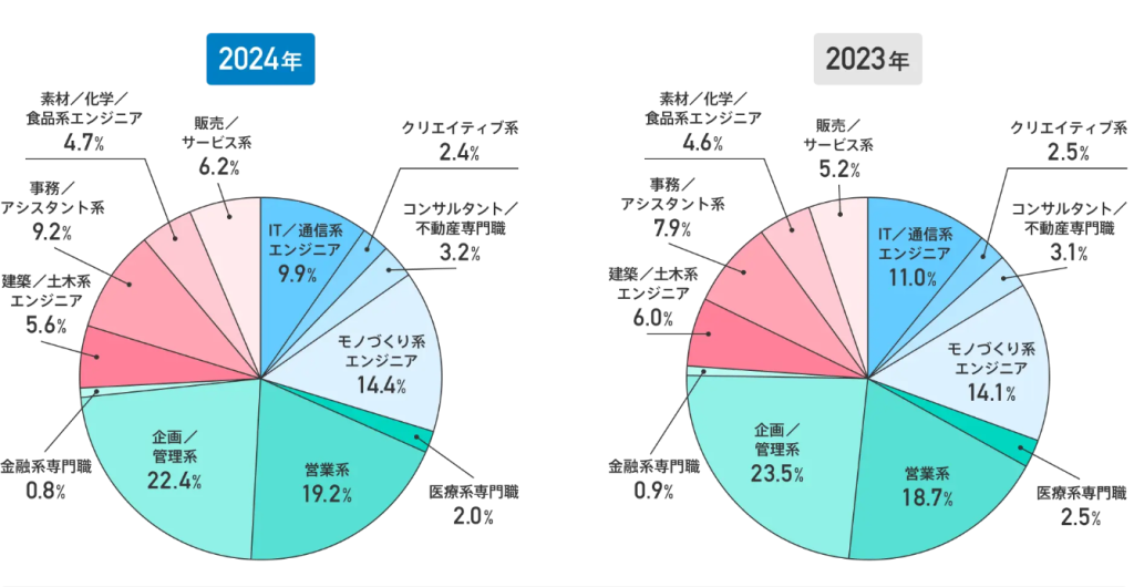 また、2024年に30代後半で転職に成功した人の転職先の職種を見ると、「企画/管理系」(22.4%)「営業系」(19.2%)がトップ2となっています。そのほかにも、「IT/通信系エンジニア」や「モノづくり系エンジニア」「建築/土木系エンジニア」などエンジニア職のニーズも高い状況です。