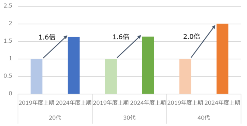 こうした即戦力人材へのニーズの高まりから、30代、40代の転職者は増加傾向にあります。実際に、dodaエージェントサービスを利用した転職者数の伸び率の推移を見ると、30代は2019年度上期から2024年度上期までで1.6倍、40代は2.0倍となっています。