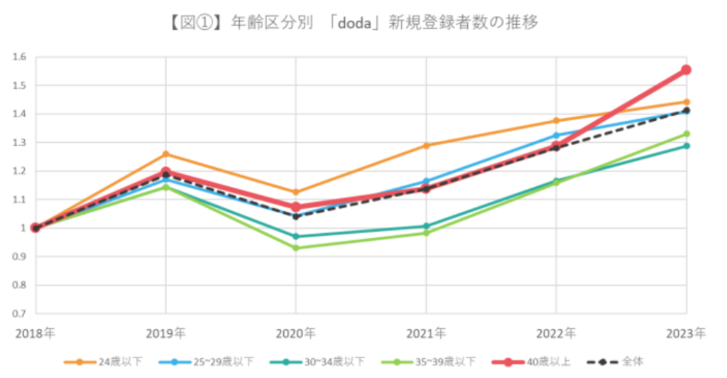 転職サービスdodaに新規で登録した人の推移を見ると、2023年40歳以上の新規登録者数は2018の年比で1.5倍以上に伸びており、ほかの年齢区分と比べても最も大きい伸び率となっています。特に、2022年から2023年にかけて40歳以上の登録者が大きく伸びており、ミドル世代の転職への関心が高まっている様子がうかがえます。