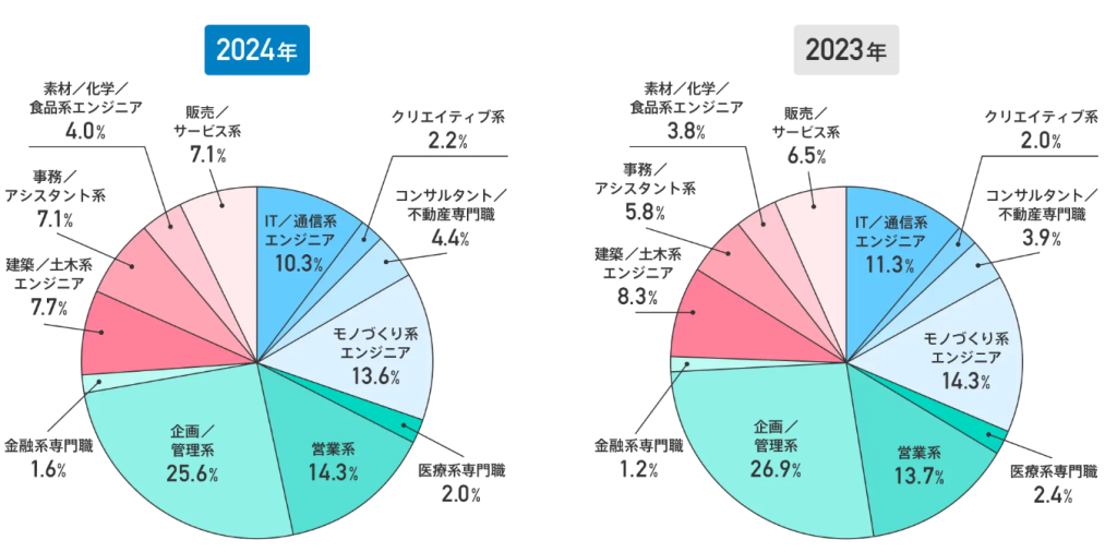 また、40歳以上で転職に成功した人の2024年の職種を見ると、一番高い割合を占めているのは、「企画/管理系」(25.6%)となっており、次に割合が高かったのは「営業系」(14.3%)となっています。