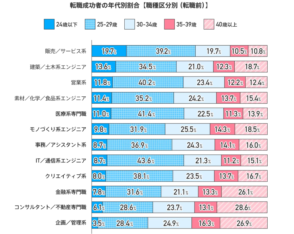 加えて、年代別での割合を見ると、「金融系専門職」(26.1%)、「コンサルタント/不動産専門職」(28.6%)の割合が他年代に比べても高いことが分かります。専門知識や経験を求められる職種での転職が多いことが、ミドル世代の転職の傾向と言えそうです。