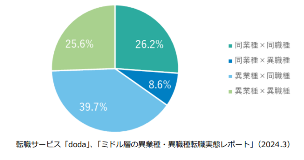 dodaの2024年3月の調査データでは、40歳以上の転職で異業種や異職種への転職の合計割合は73.9%に上りました。