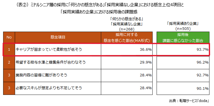 調査では、ミドルシニア層の採用に関して、企業が最も懸念しているのは「キャリアが固まっていて柔軟性が低そう(36.6%)」という点です。