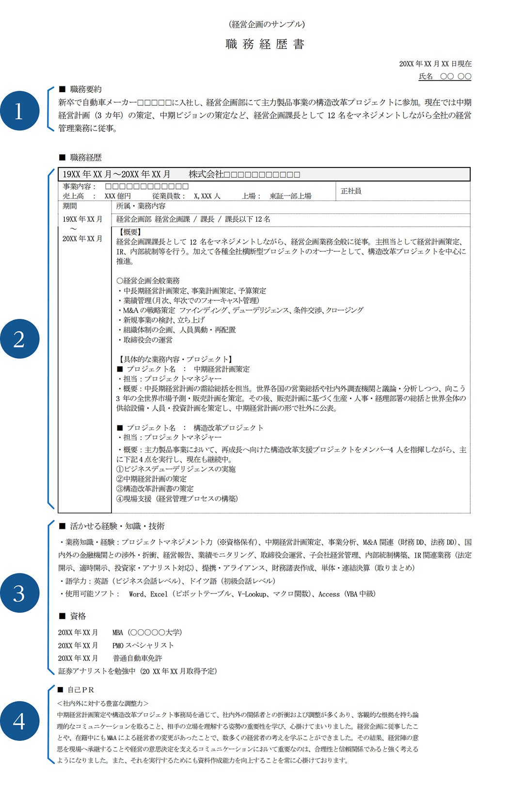 - 採用担当者が短時間で「募集要件に合致すると判断できるか」「要約以降の内容(職務経歴詳細や自己PR)を読み進めやすくなるか」を意識して記載する。